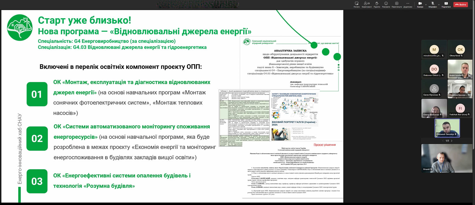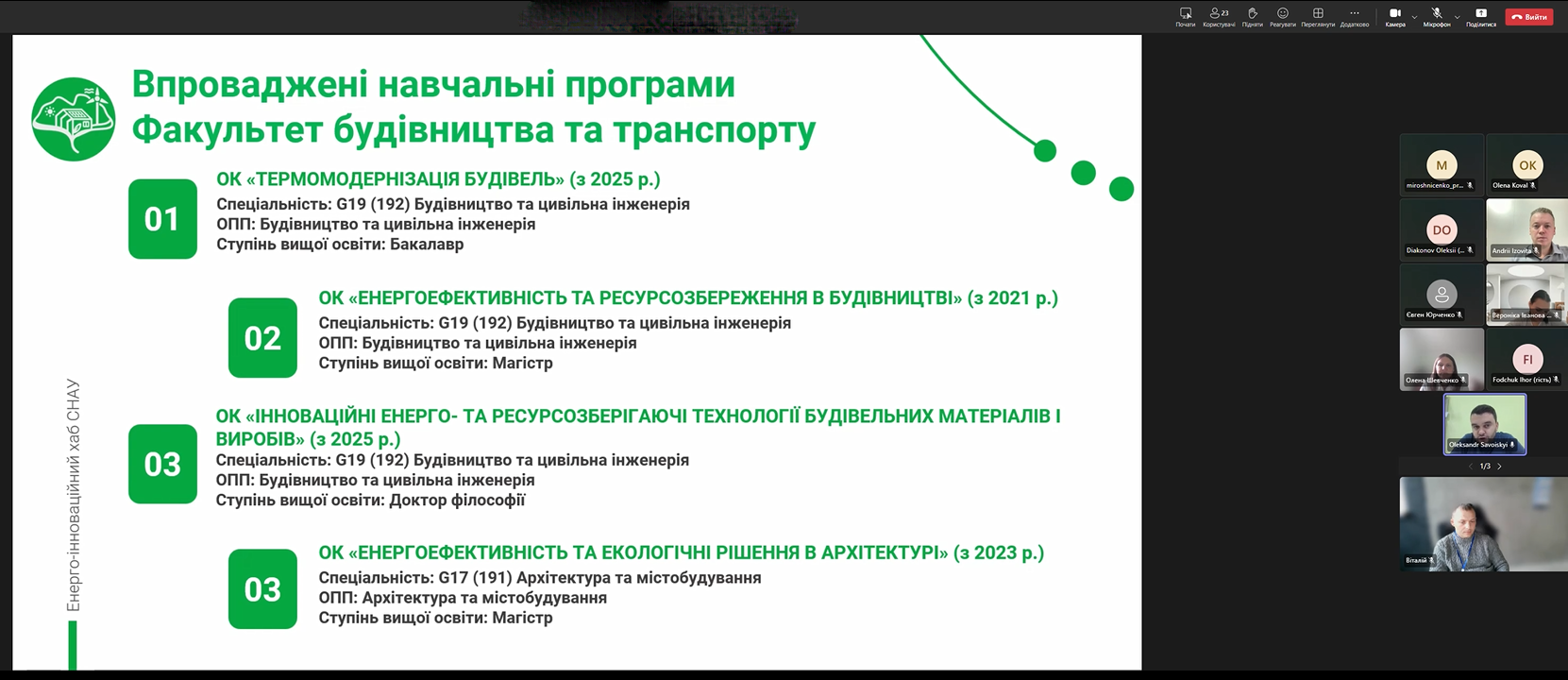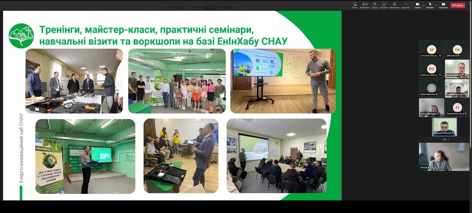 21 жовтня 2025 року Енергоінноваційний хаб Сумського національного аграрного університету долучився до вебінару GIZ «Оцінка сталості впровадження навчальних програм з енергоефективності у закладах вищої освіти», який відбувся у форматі онлайн.