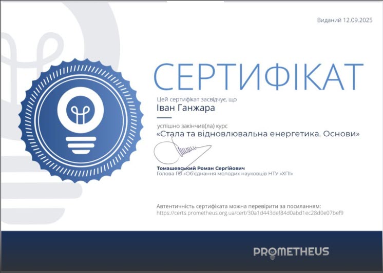 Упродовж вересня 2025 року студенти-магістри 1 курсу факультету будівельних технологій Сумського національного аграрного університету успішно пройшли та завершили онлайн-курс «Стала та відновлювальна енергетика. Основи» на освітній платформі Prometheus.