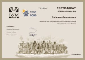 Здобувачі вищої освіти Владислав ГРУНІЧ, Сніжана ОНИШКЕВИЧ та Анна БЕРДНИК прийняли участь у заході Відкритого університету ВУМ (vum.org.ua) за курсом «Енергоефективність багатоквартирного будинку в дії» розробленого НаУКМА-онлайн за підтримки проекту «Енергоефективність у житловому секторі України» IFC (група Світового банку), що здійснюється за фінансування Швейцарської Конфедерації та отримали сертифікати №131016 від 01.10.2025, №132440 від 20.10.2025 та №132921 від 24.10.2025 відповідно.
