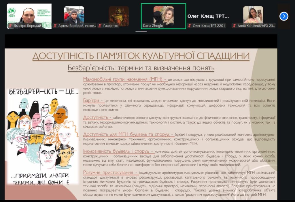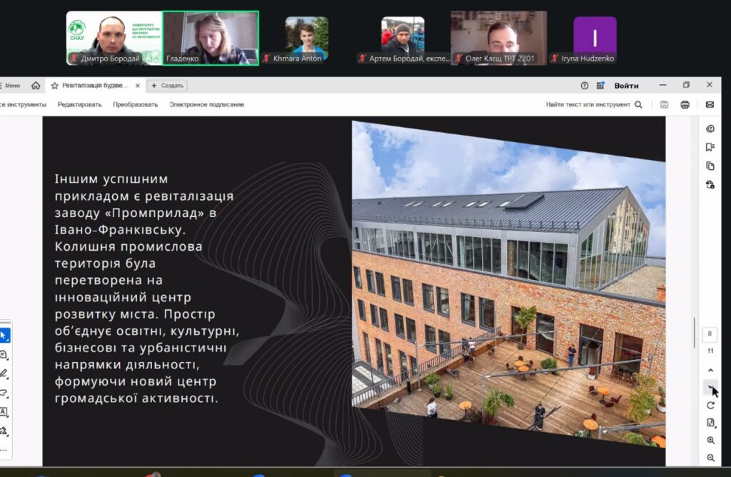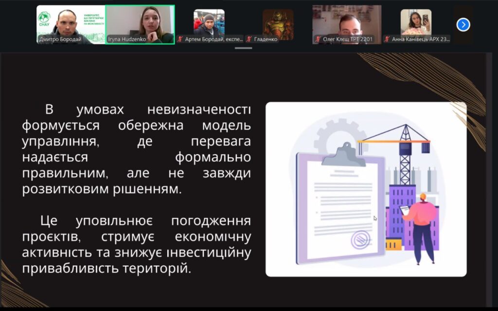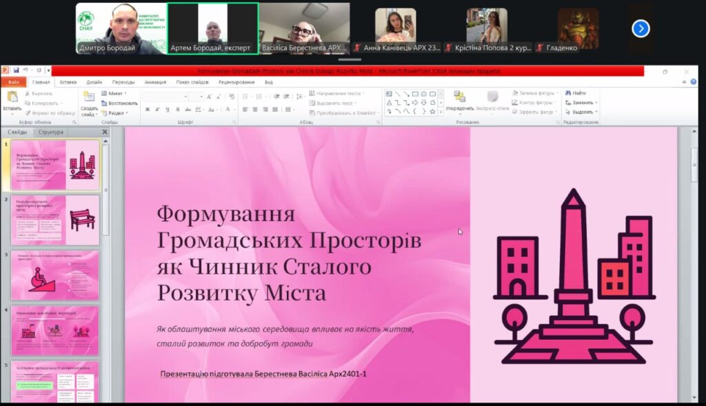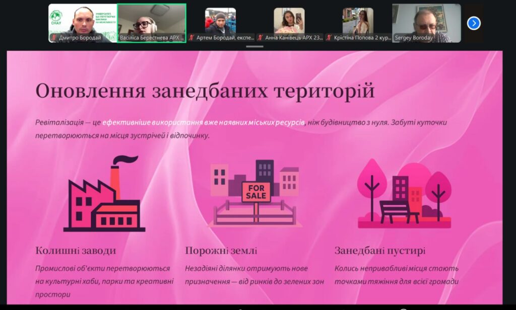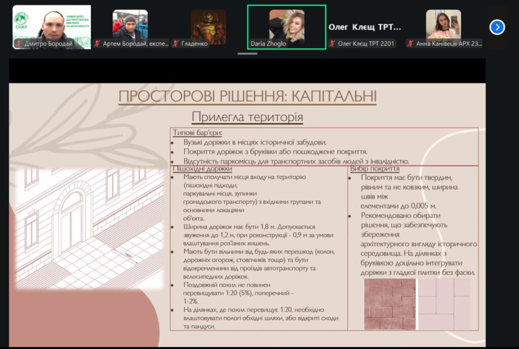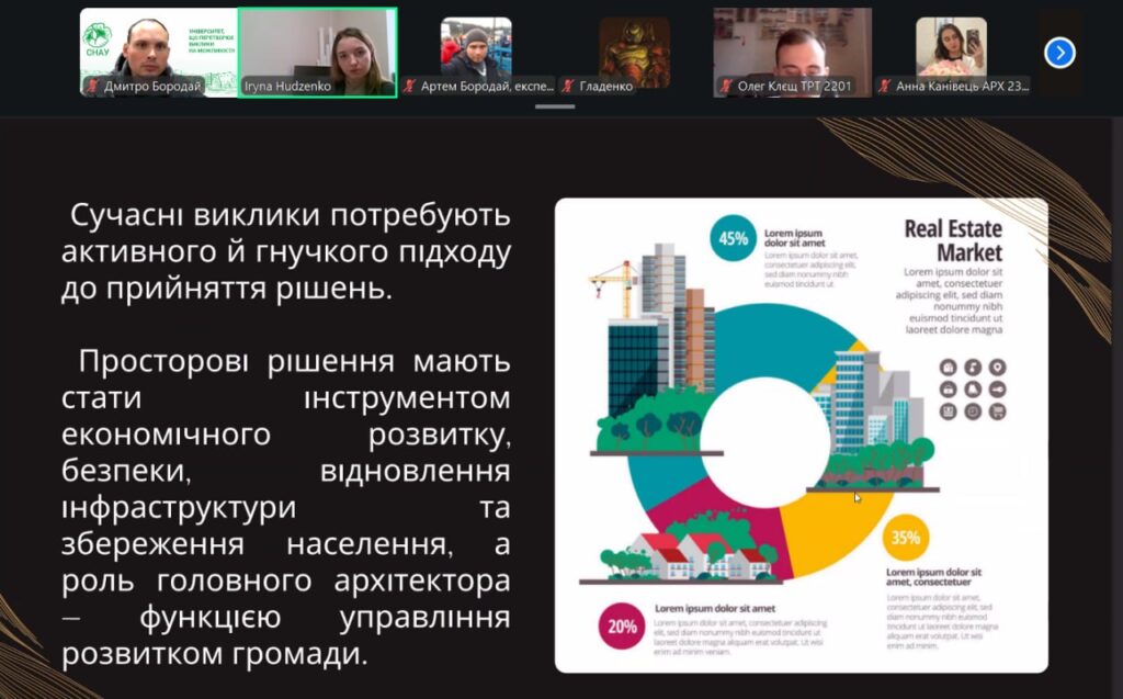 У рамках конференції учасники представили змістовні доповіді та презентації, присвячені питанням сталого розвитку, інклюзивності, охорони пам’яток архітектури, зеленої архітектури, ревіталізації, сучасних будівельних технологій і матеріалів, новітніх тенденцій в архітектурі та розвитку логістики. Порушені теми викликали жвавий інтерес і стали підґрунтям для активних дискусій та обміну думками.