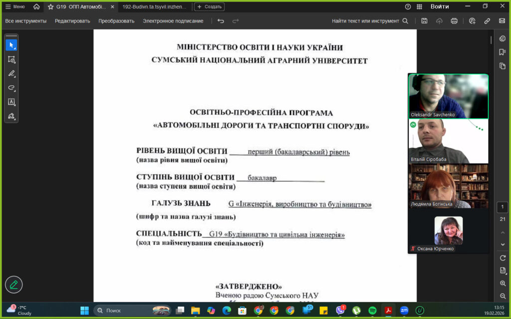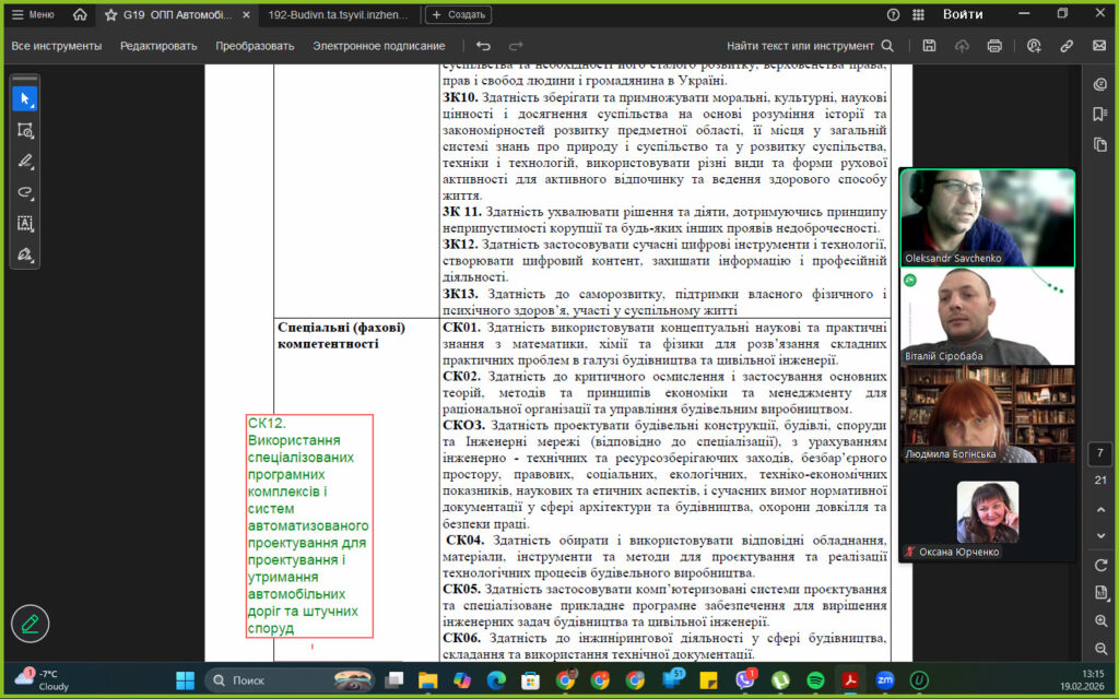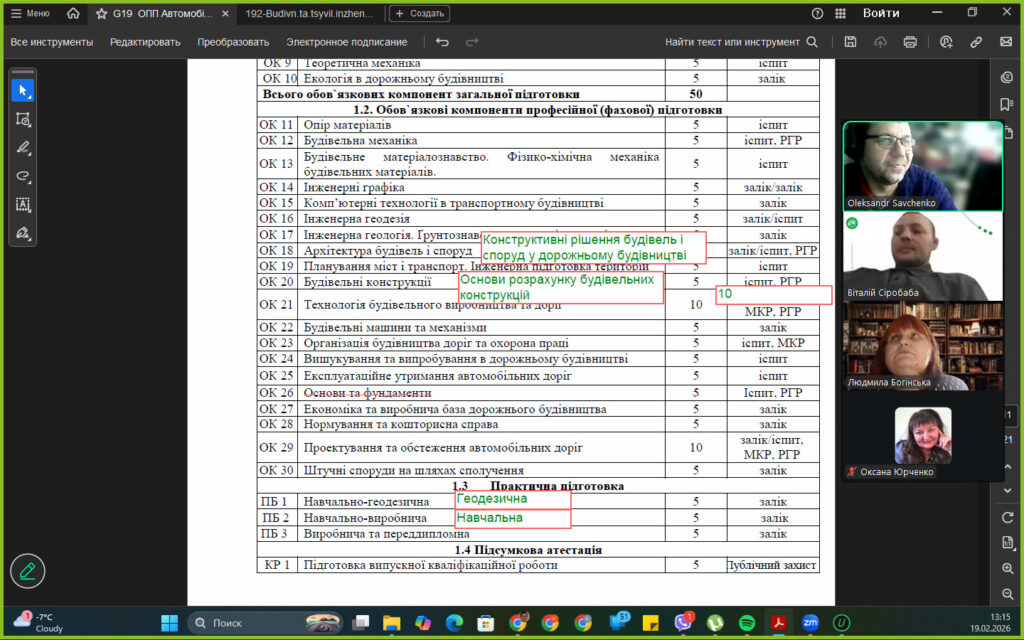 19.02.2026 р відбулось засідання проєктної групи ОПП «Автомобільні дороги та транспортні споруди» ОС Бакалавр на 2026 рік з метою формування проєкту освітньо-професійної програми.  Засідання проводив гарант ОПП к.т.н., доцент, завідувач кафедри будівництва та експлуатації будівель, доріг та транспортних споруд Олександр Савченко.