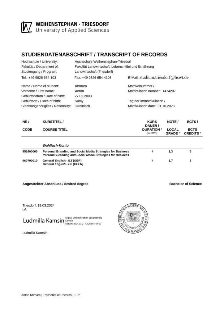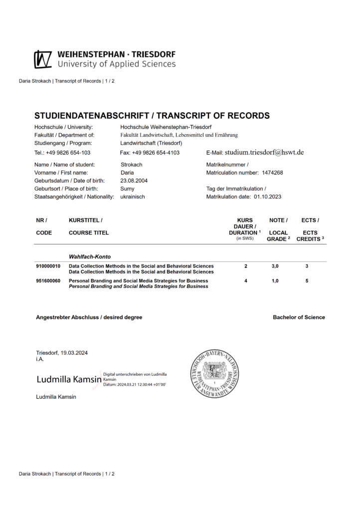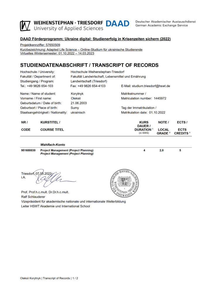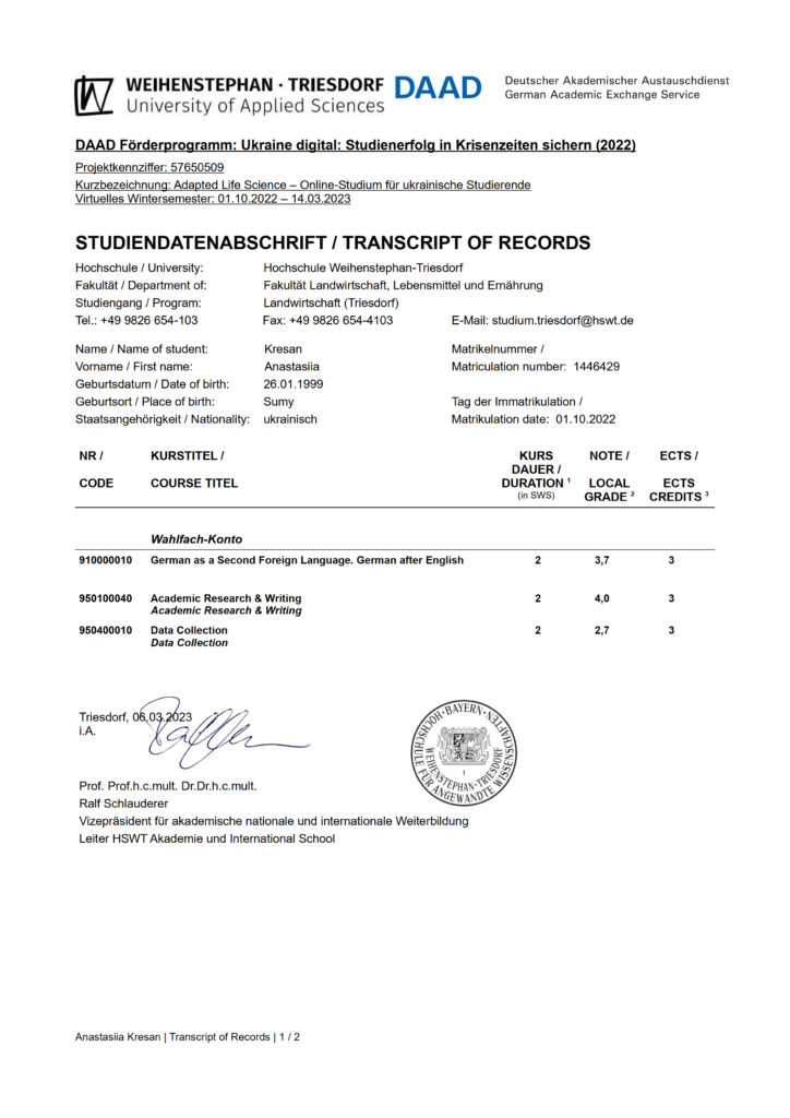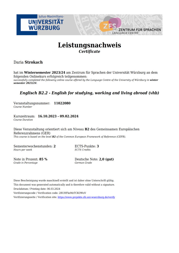Так студентка 3 курсу ОС «Бакалавр» Анастасія Кресан успішно пройшла навчання за наступними курсами: «German as a Second Foreign Language. German after English» («Німецька, як друга іноземна мова після англійської»), «Academic Research & Writing» («Академічні дослідження і письмо»), Data Collection («Збір даних»). Студент 3 курсу ОС «Бакалавр» Олексій Коритник успішно склав курс «Project Management (Project Planning)» («Управління проєктами»).