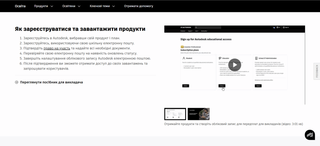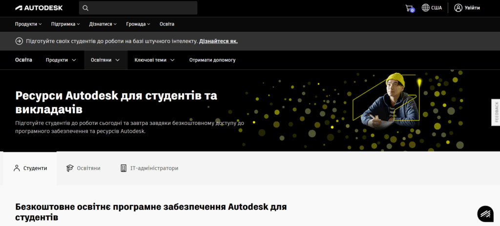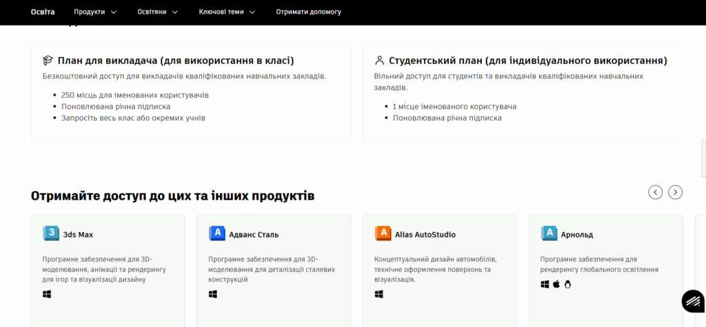 Кожен студент має можливість зареєструватися на сайті компанії Autodesk за посиланням https://www.autodesk.com/education/home і отримати актуальну навчальну ліцензійну версію спеціалізованих програмних продуктів компанії Autodesk: AutoCAD, 3DS Max, Revit ,підтвердивши статус студента відповідним документом (студентським квитком, довідкою). Алгоритм реєстрації вказаний нижче.