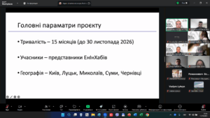 Під час першої робочої зустрічі учасники обговорили основні завдання проєкту, етапи впровадження та механізми координації між Енерго-Інноваційними Хабами й університетами-учасниками.