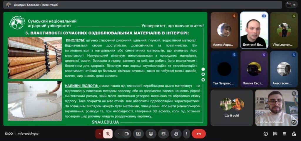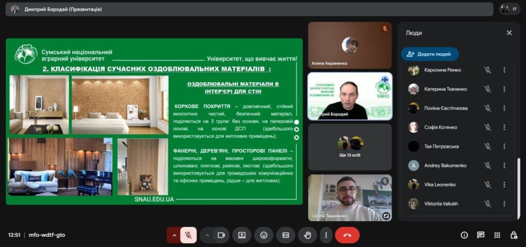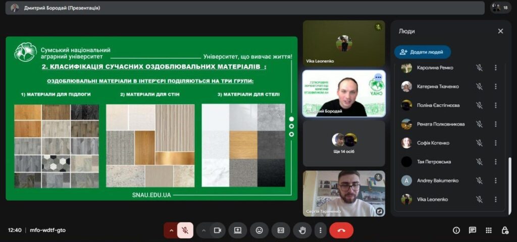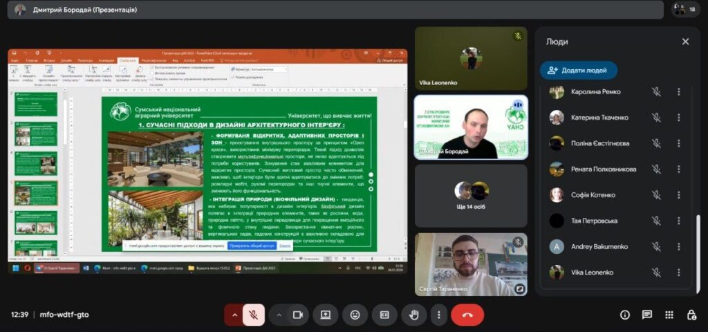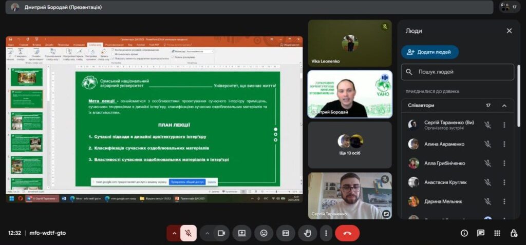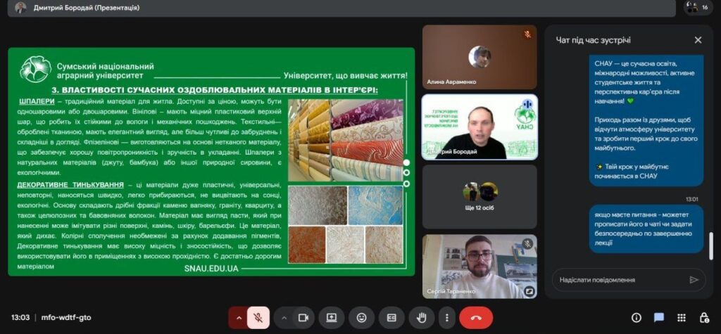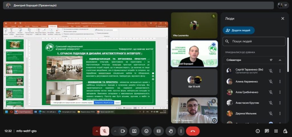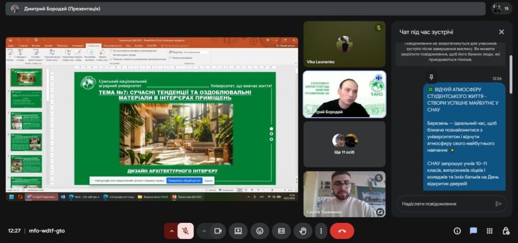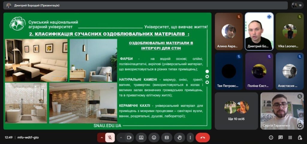 У рамках профорієнтаційної роботи і співпраці з Сумським фаховим коледжем будівництва та архітектури у четвер 26 березня відбулася онлайн-зустріч зі студентами коледжу IV курсу спеціальностей 191 «Архітектура та містобудування» ОПП «Архітектурне проєктування та внутрішній інтер’єр» та 192 «Будівництво та цивільна інженерія» ОПП «Опорядження будівель і споруд та будівельний дизайн». Захід було організовано у вигляді тематичної лекції на тему: «Сучасні тенденції та оздоблювальні матеріали в інтер’єрах приміщень» за сприяння доцента кафедри архітектури та інженерних вишукувань Дмитра БОРОДАЯ, що до того ж виступив у ролі лектора, та старшого викладача кафедри архітектури та інженерних вишукувань Сергія ТАРАНЕНКА.