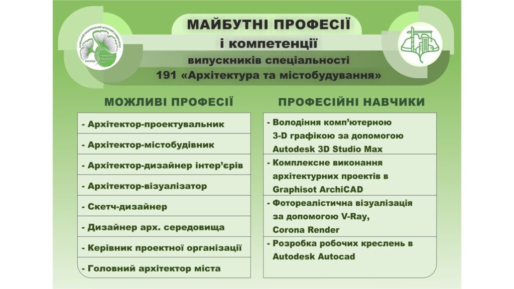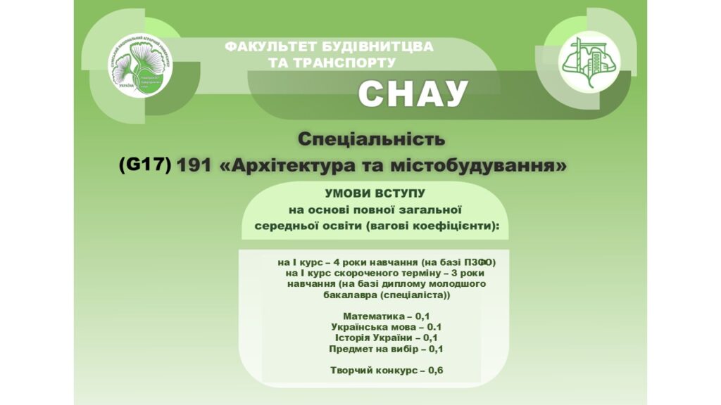 З 2018 року ведеться підотовка за ОС “Магістр” зі спеціальності G17 (191) “Архітектура та містобудування”