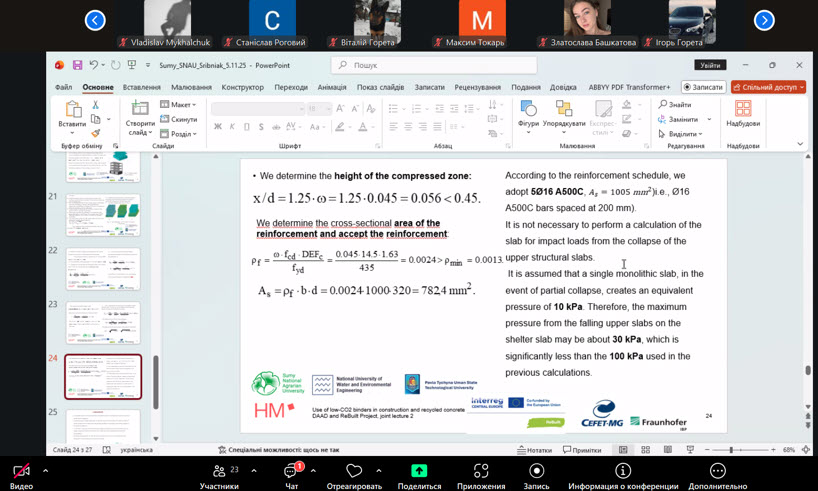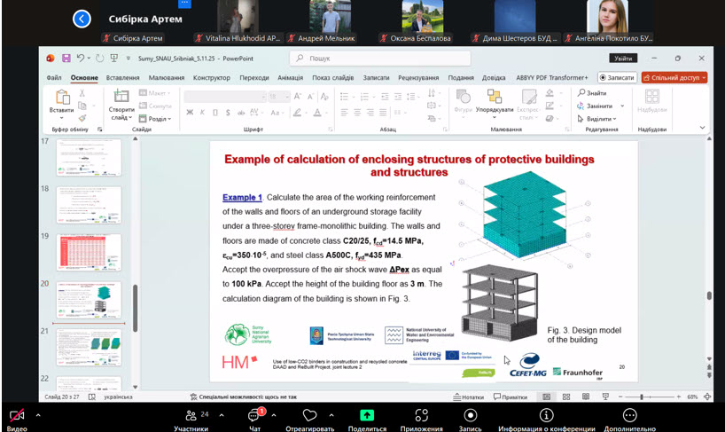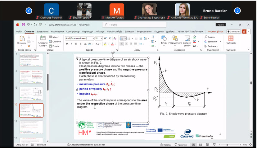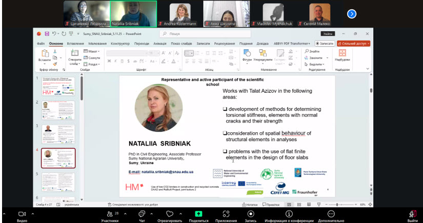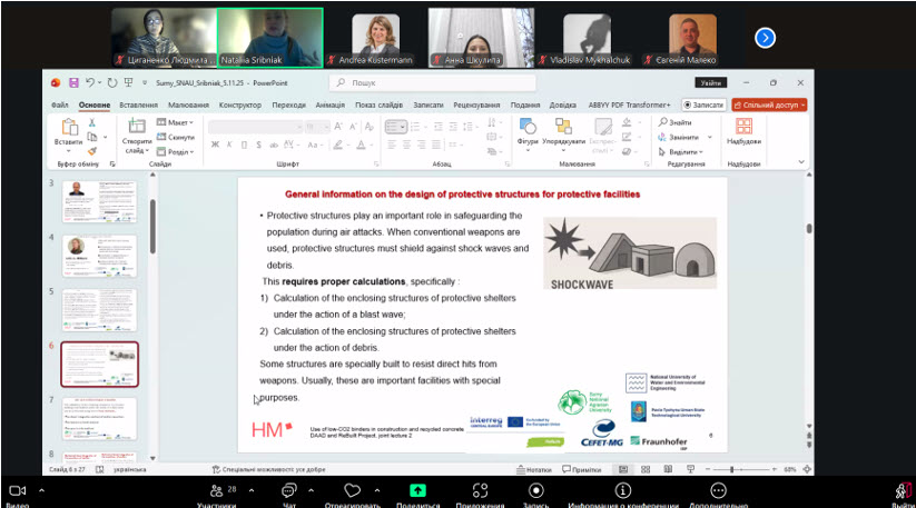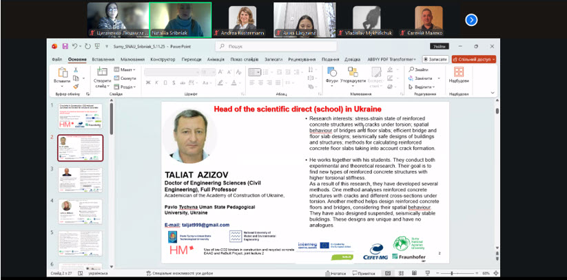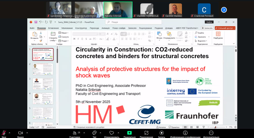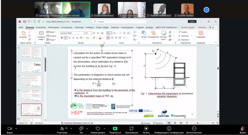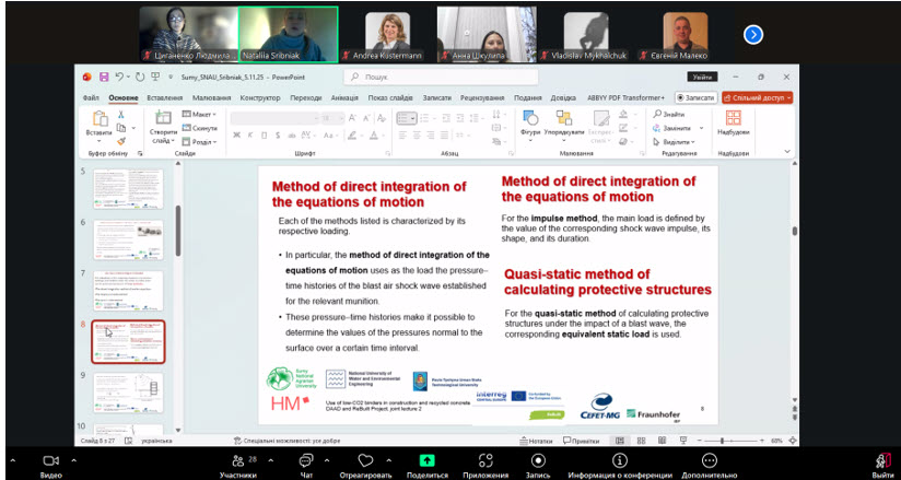 Доцент кафедри будівельних конструкцій Срібняк Н.М. виступила з доповіддю “Analysis of protective structures for the impact of shock waves” в циклі міжнародних лекцій “Circularity in Construction: CO2-reduced concretes and binders for structural concretes”, організованого в рамках Угоди про вітруальний академічний обмін мід СНАУ та MUAS (Мюнхен, Німеччина).