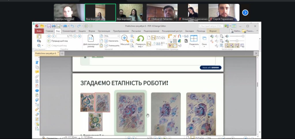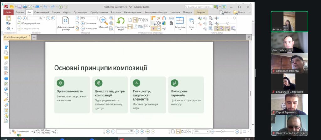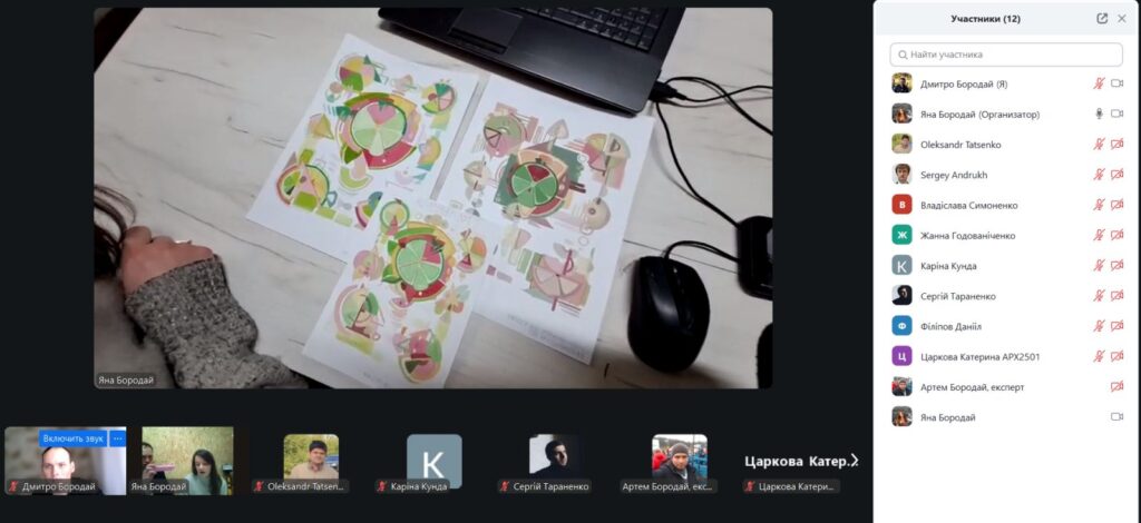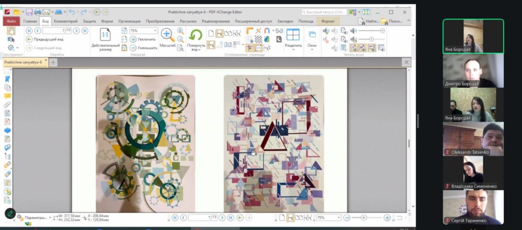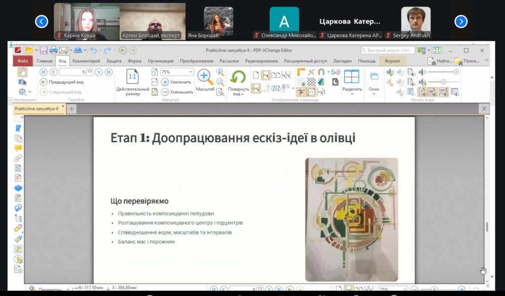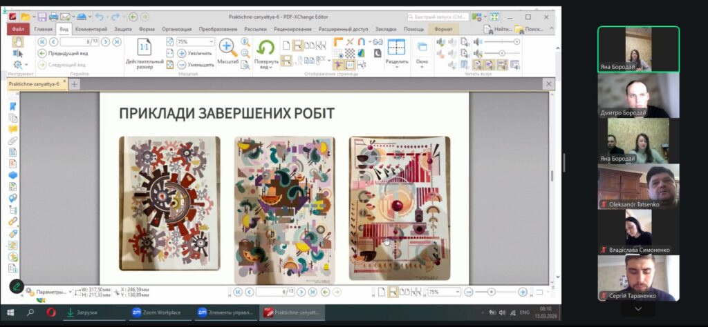 13 березня 2026 року на 1-й парі о 8-00 вібулося відкрите практичне заняття для студентів 1-го курсу курсу ОС “бакалавр” за ОПП “Архітектура та містобудування” з дисципліни “Архітектурна та об’ємно-просторова композиція”, яку проводила старша викладачка кафедри архітектури та інженерних вишукувань Бородай Яна Олегівна. Темою заняття було: “Робота над ескіз-ідеєю результуючої площинної композиції та її погодження”. Заняття відбулося у змішаному форматі – частина студентів були присутніми в аудиторії в безпечному укриття, частина студентів доєдналися до заняття онлайн в Zoom. На початку заняття викладачка представила тему, мету та план заняття, коротко представила рекомендовану літературу та нагадала про особливості роботи над композицією в нинішньому семестрі. Далі викладачка проводила індивідуальні консультації кожного студента, давала свої рекомендації щодо подальшого удосконалення робіт та погоджувала ескіз-ідеї студентів. Викладачка доволі успішно консультувала студентів як в режимі оффлайн, так і онлайн. Студенти, які вже проконсультувалися, отримували рекомендації та продовжували працювати, мали можливість подивитися на роботи своїх колег і побачити, які рекомендації отрмують вони у своїх роботах. Заняття відбулося у дружній атмосері з постійним жвавим спілкуванням викладачки і студентів. Після заняття відбулося його обговорення. Присутні викладачі Таценко О.В., Бородай  Д.С., Андрух С.Л., Тараненко С.В., Бородай А.С., Чередниченко О.В., Бородай С.П. відмітили високий методичний рівень проведення заняття.