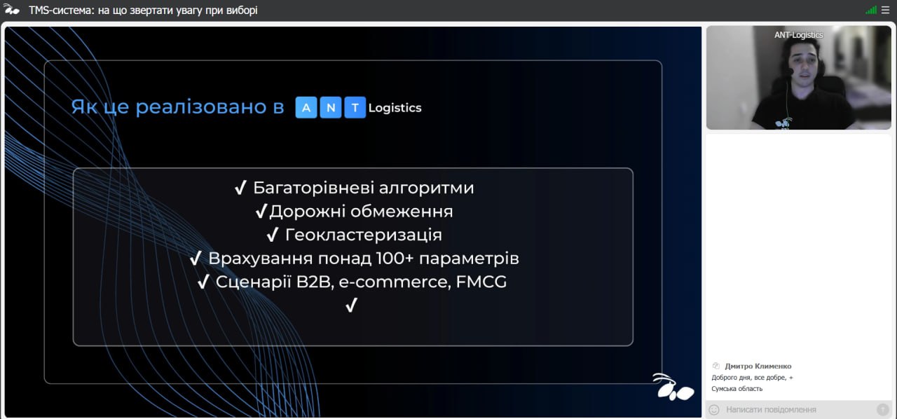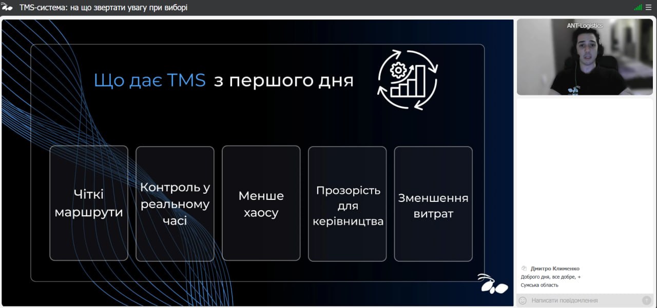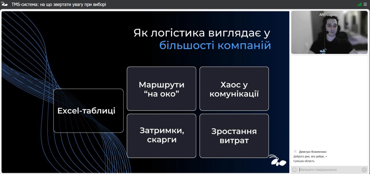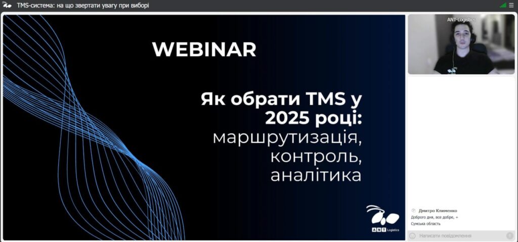 26 листопада 2025 року здобувачі та НПП кафедри транспортних технологій долучилися до онлайн-вебінару від Команди ANT-Logistics, присвяченого практичним аспектам вибору ефективної TMS-системи.
