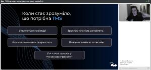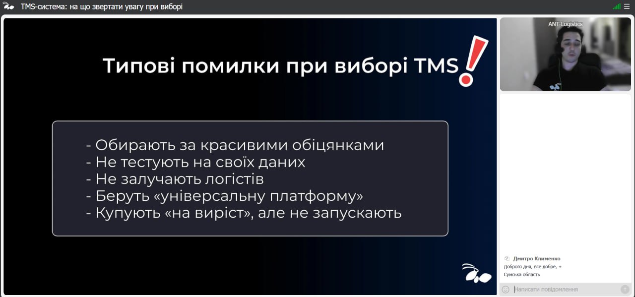 Під час зустрічі було детально розглянуто ключові критерії, типові помилки та приховані нюанси, які впливають на впровадження TMS і кінцевий результат у транспортних технологіях. Спікер Антон ОВЧАРЕНКО пояснив, як визначити, чи справді система оптимізує маршрути, які інтеграції є обов’язковими, як передбачити зручність для водіїв та яким чином коректно розрахувати ROI при впровадженні TMS-рішень. Окремо наголошено на поширених помилках, через які TMS не запускається або працює неефективно.