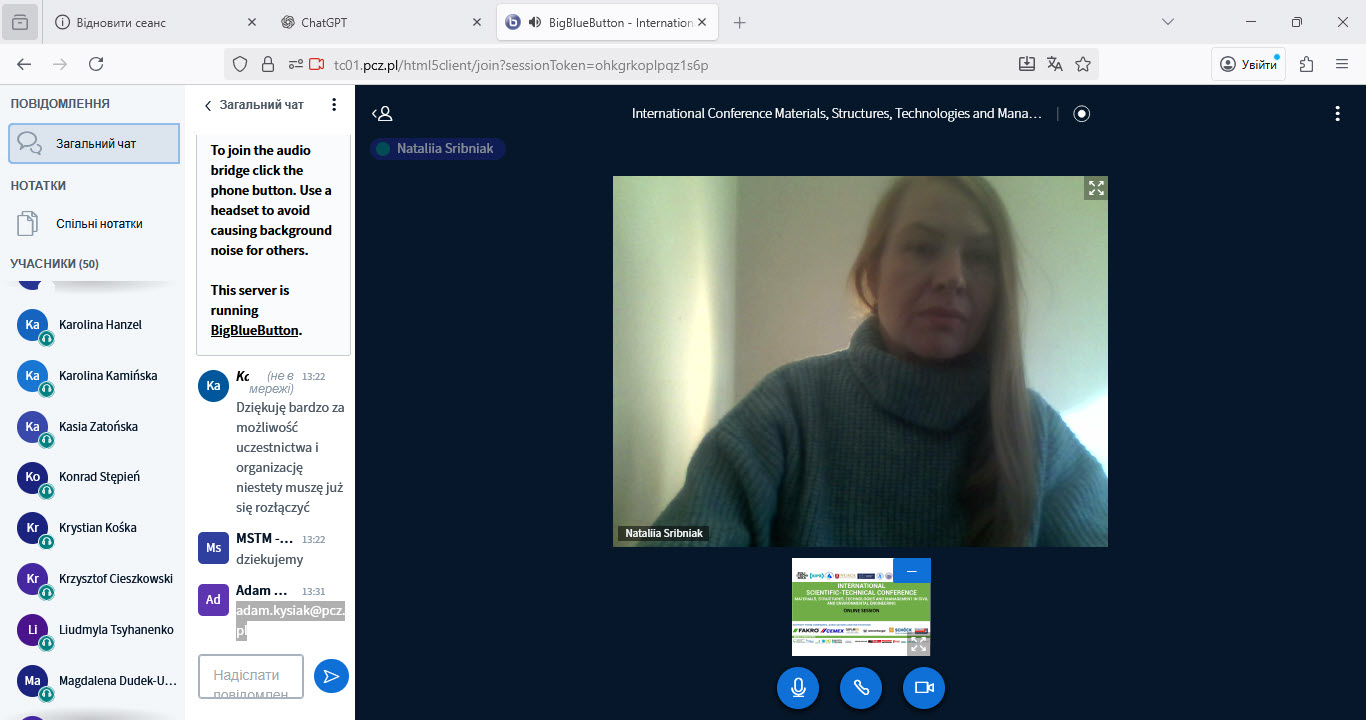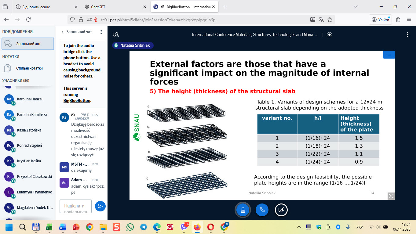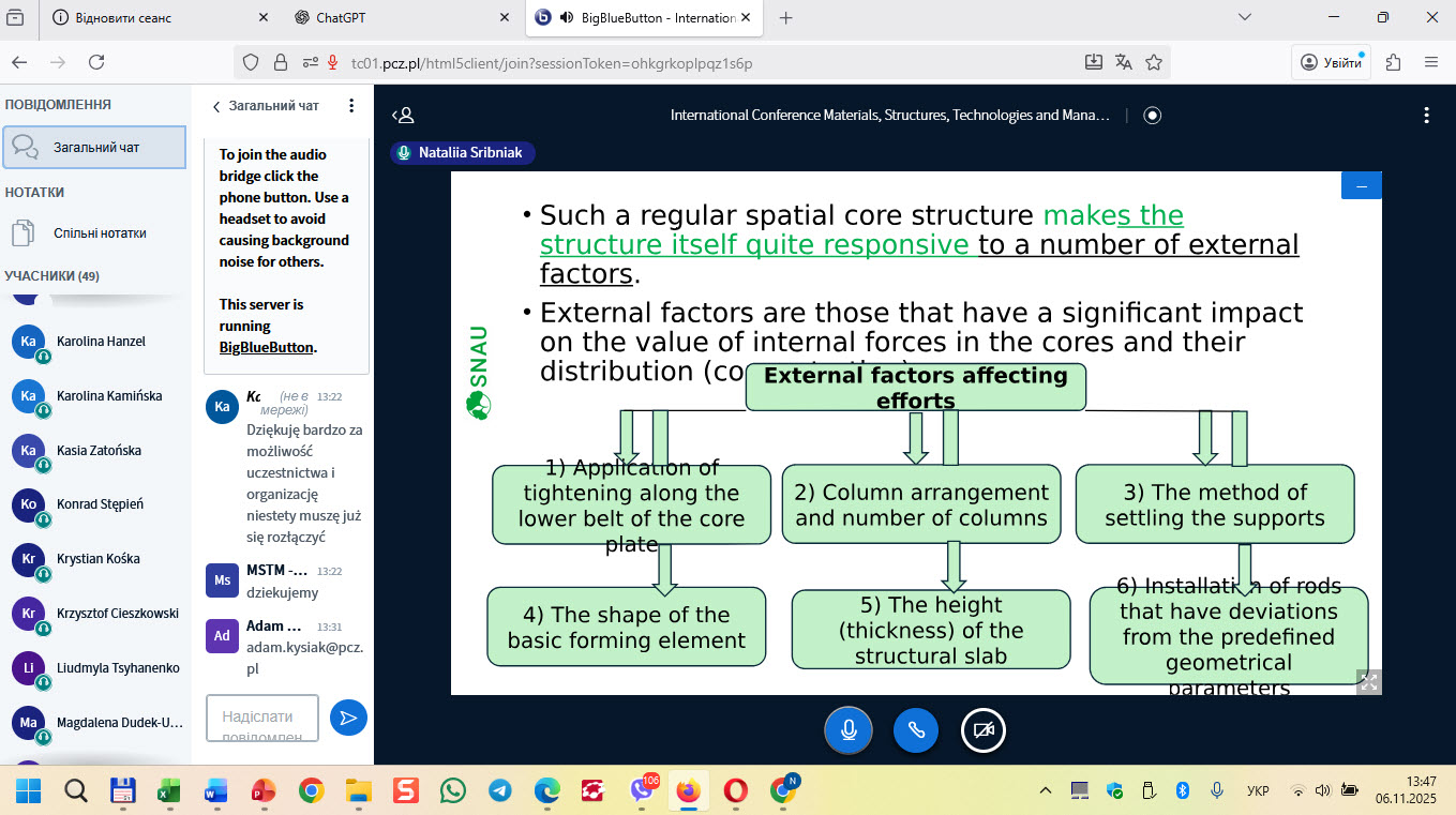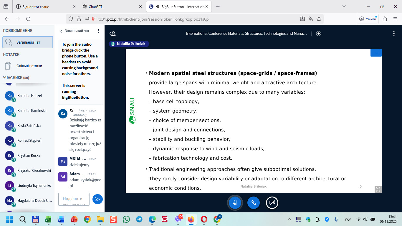 6 листопада 2025 року в он-лайн форматі відбувся виступ доцента кафедри будівельних конструкцій Срібняк Н.М. за темою “Force regulators in space grid cover structures” на Щорічній Міжнародній конференції “INTERNATIONAL CONFERENCE Materials, Structures, Technologies and Management in Civil and Environmental Engineering”.